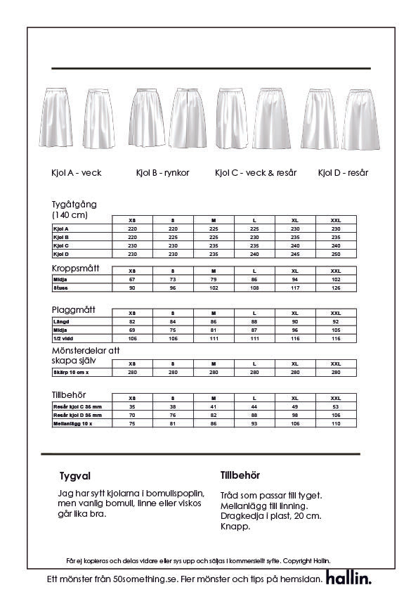 Kjolen går att sy i många olika tyger, bomullpoplin, vanlig bomull, linne eller en tunnare ull. Mina kjolar är alla sydda i bomullspoplin. Den går bra att sy i viscose men då kommer tyget att falla närmare kroppen.