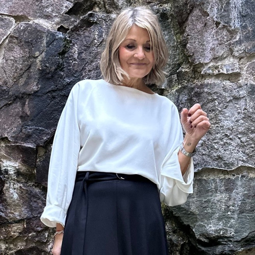 Iris är en så fin blus med härlig tyngd. Den har en så kallad pingvinärm och en riktigt bred och vid manschett. Lite kortare men går ändå att stoppa in. Kanske bara framtill för en bra balans?!