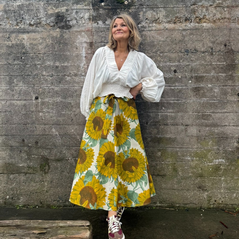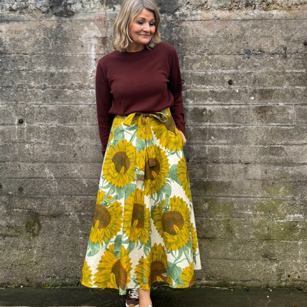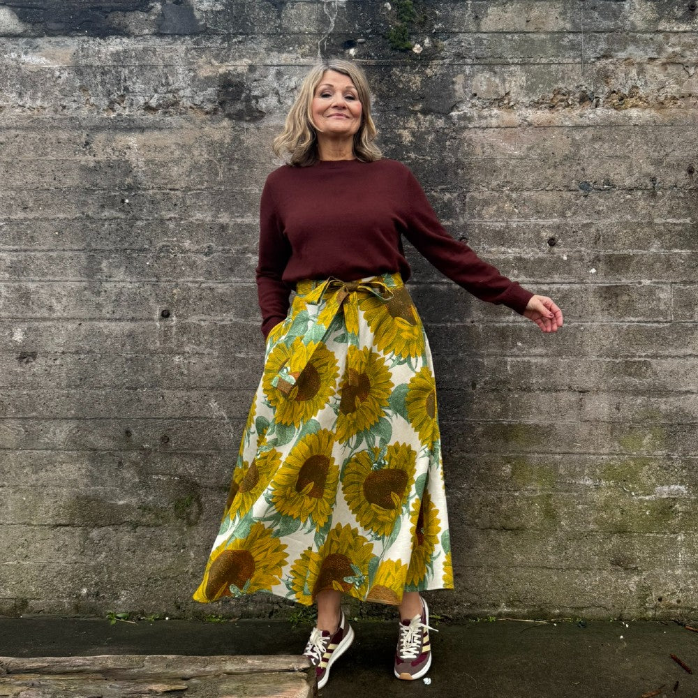 Jag har alltid varit kär i Lisa Bengtssons inredningstyger men när vi träffades på Formexmässan i höstas fick jag en stark idé om att skapa kjolar av hennes fantastiska mönster. Nu har det provsytts några olika modeller och den absolut snyggaste blev den här kjolen som heter Emilia. Jag är så nöjd över hur resultatet blev och kan inte tänka mig härligare kjolar att svassa runt i när det blir lite varmare ute. Jag har sytt upp kjolen i två färgställningar/mönster. Dels det här med solrosor som heter Sunday och ett med kvinnoansikten som heter Leila. Båda så fina på sitt sätt.