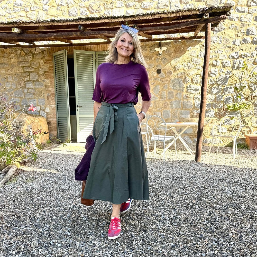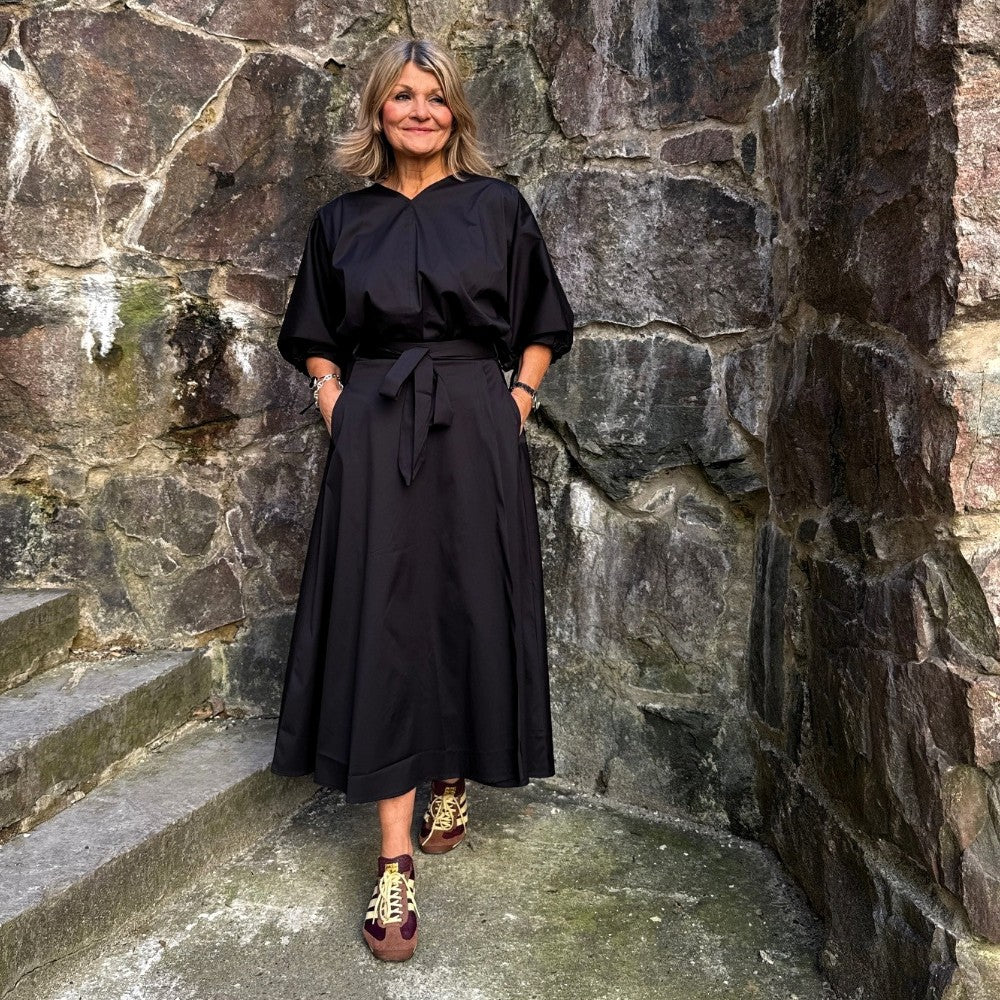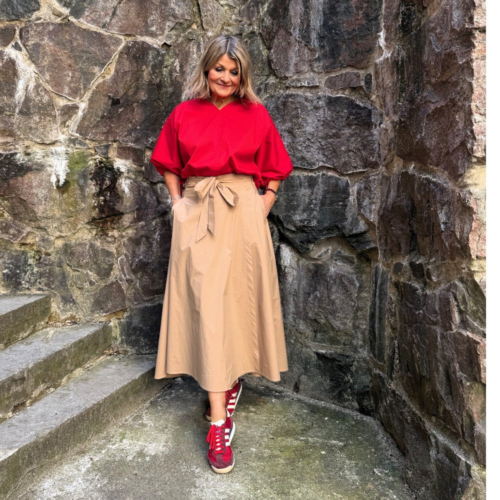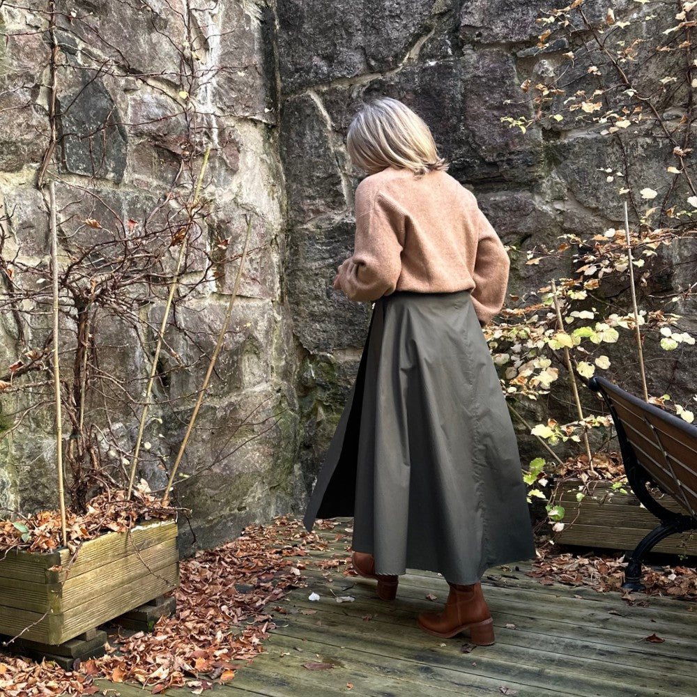 Ingegerd är underbar omlottkjol med mycket vidd och en rejäl omlott. Den är sydd i en riktigt fin bomullspoplin i hög kvalitet som faller fint. Den har fickor förstås och omlotten täcker ordentligt, även när man rör sig!