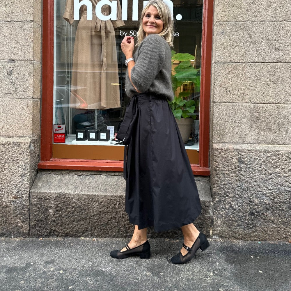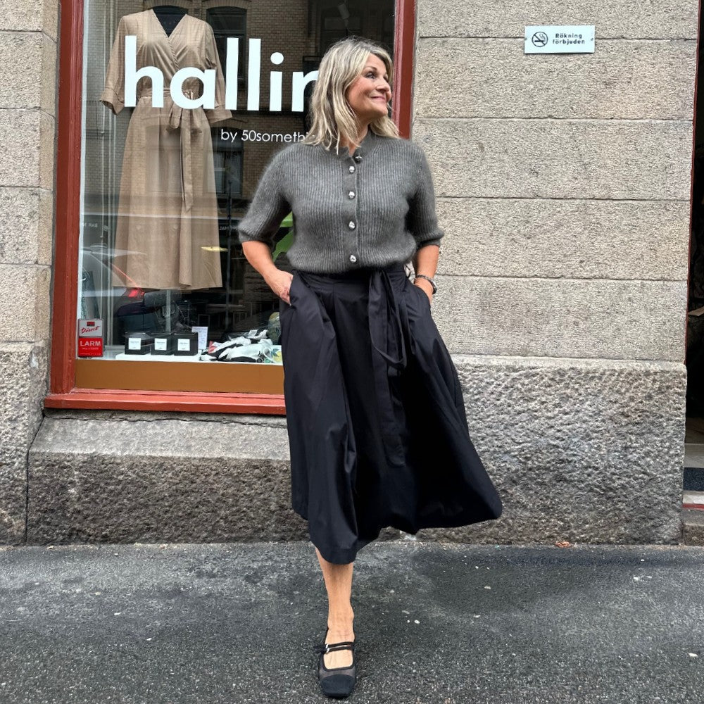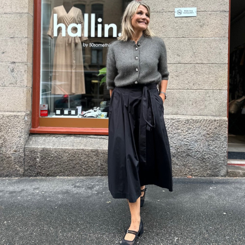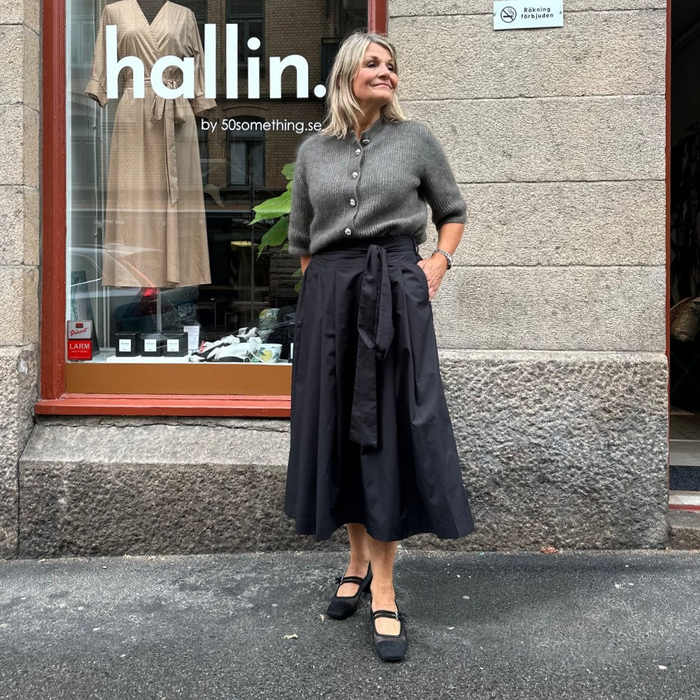Det är en arbetad modell med lagda veck fram och resår bak så att den ska kännas bekväm. Tyra har hällor i sidorna och baktill så att du kan trä in knytbandet som ingår men det går också förstås att välja ett eget bälte. En alldeles ljuvlig kjol i en tidlös modell som passar året runt! Just nu finns den i svart och khakibeige.