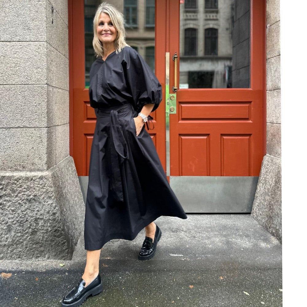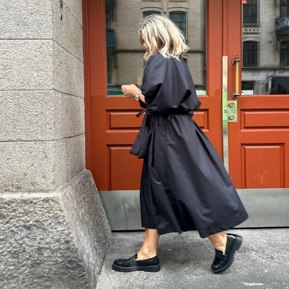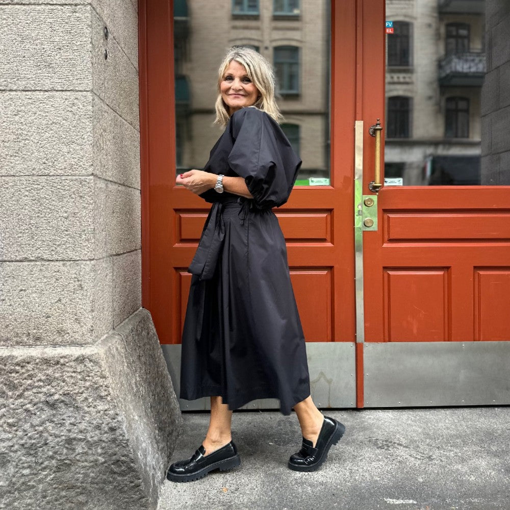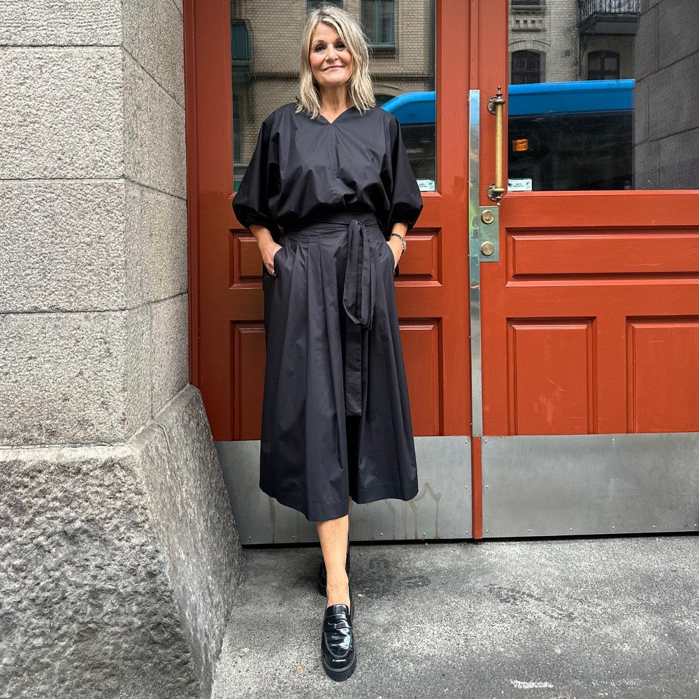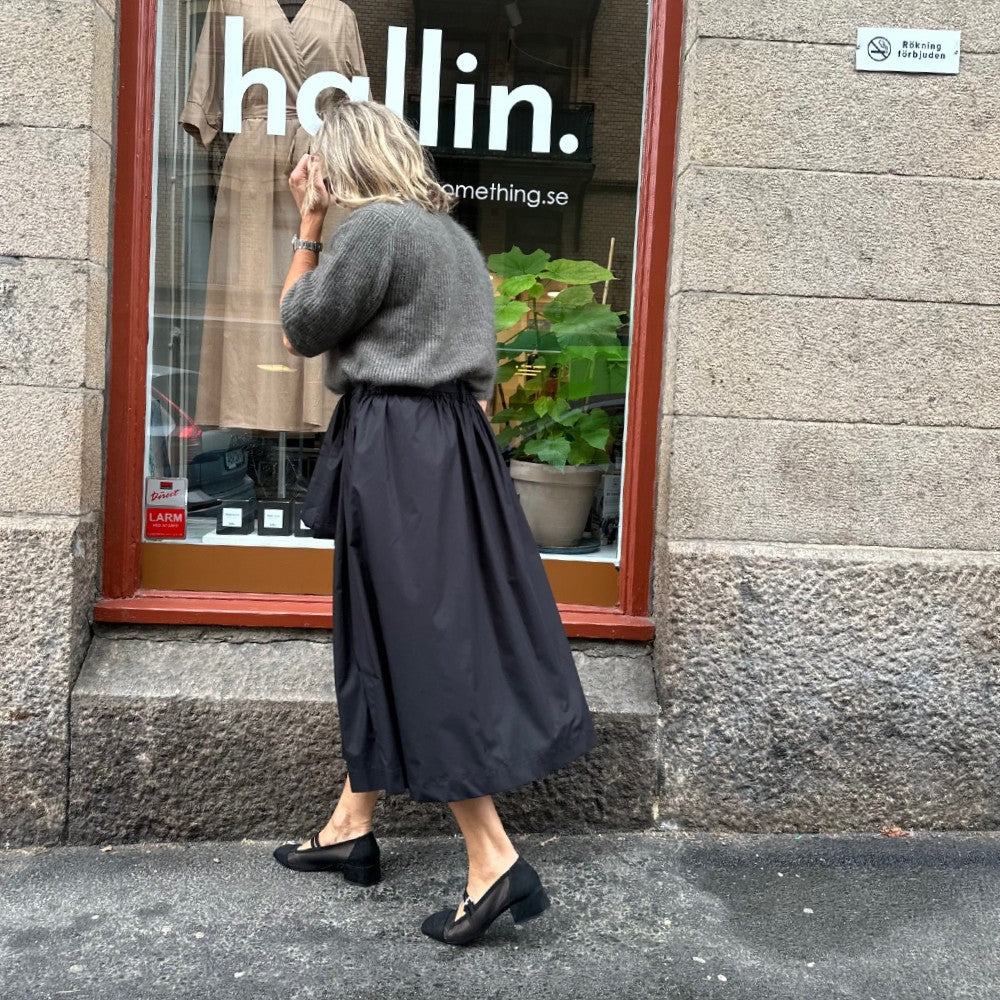 Det är en arbetad modell med lagda veck fram och resår bak så att den ska kännas bekväm. Tyra har hällor i sidorna och baktill så att du kan trä in knytbandet som ingår men det går också förstås att välja ett eget bälte. En alldeles ljuvlig kjol i en tidlös modell som passar året runt! Just nu finns den i svart och khakibeige.