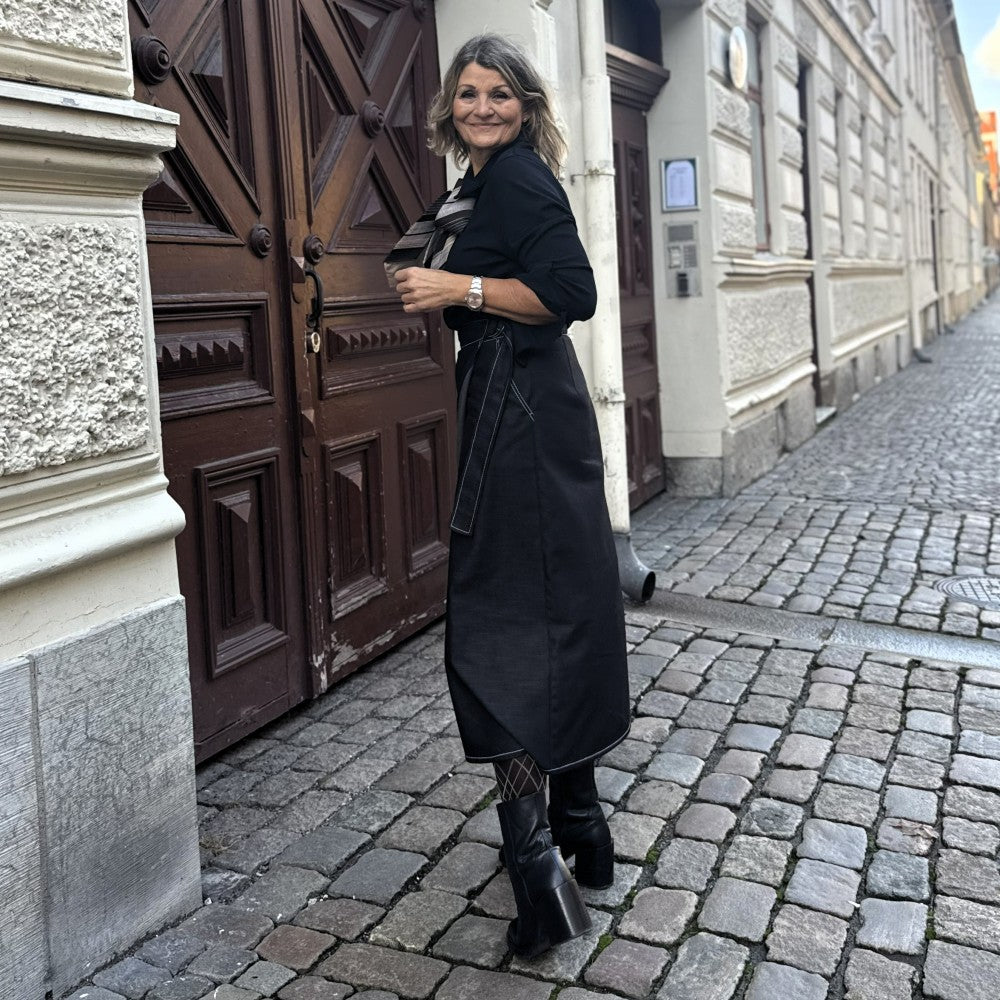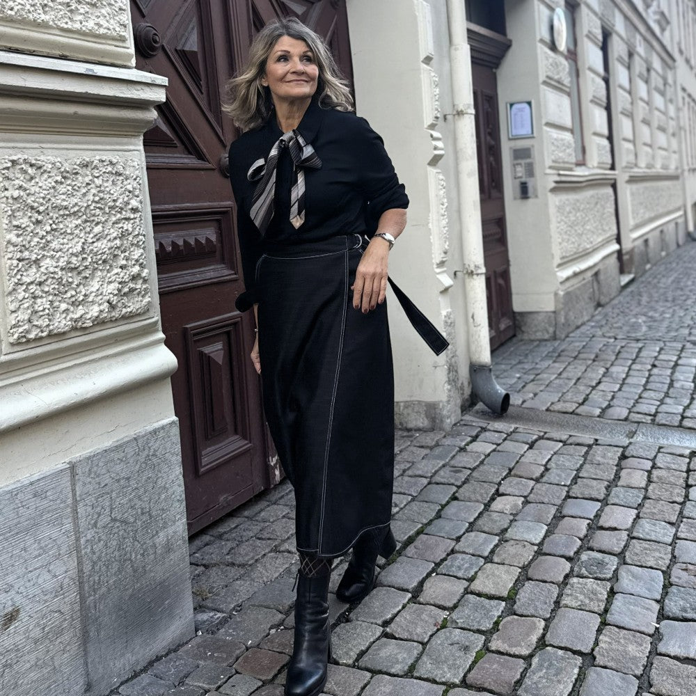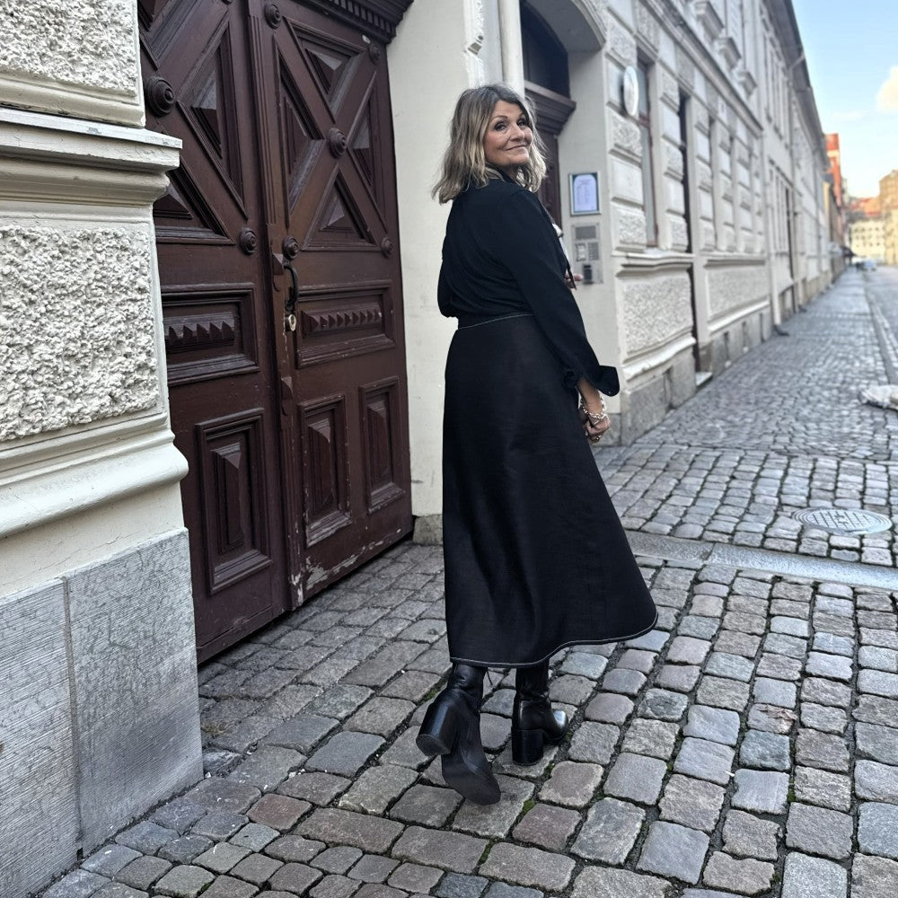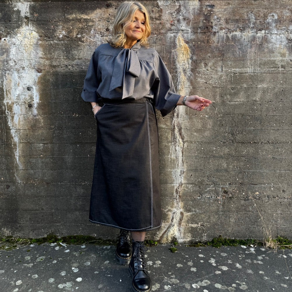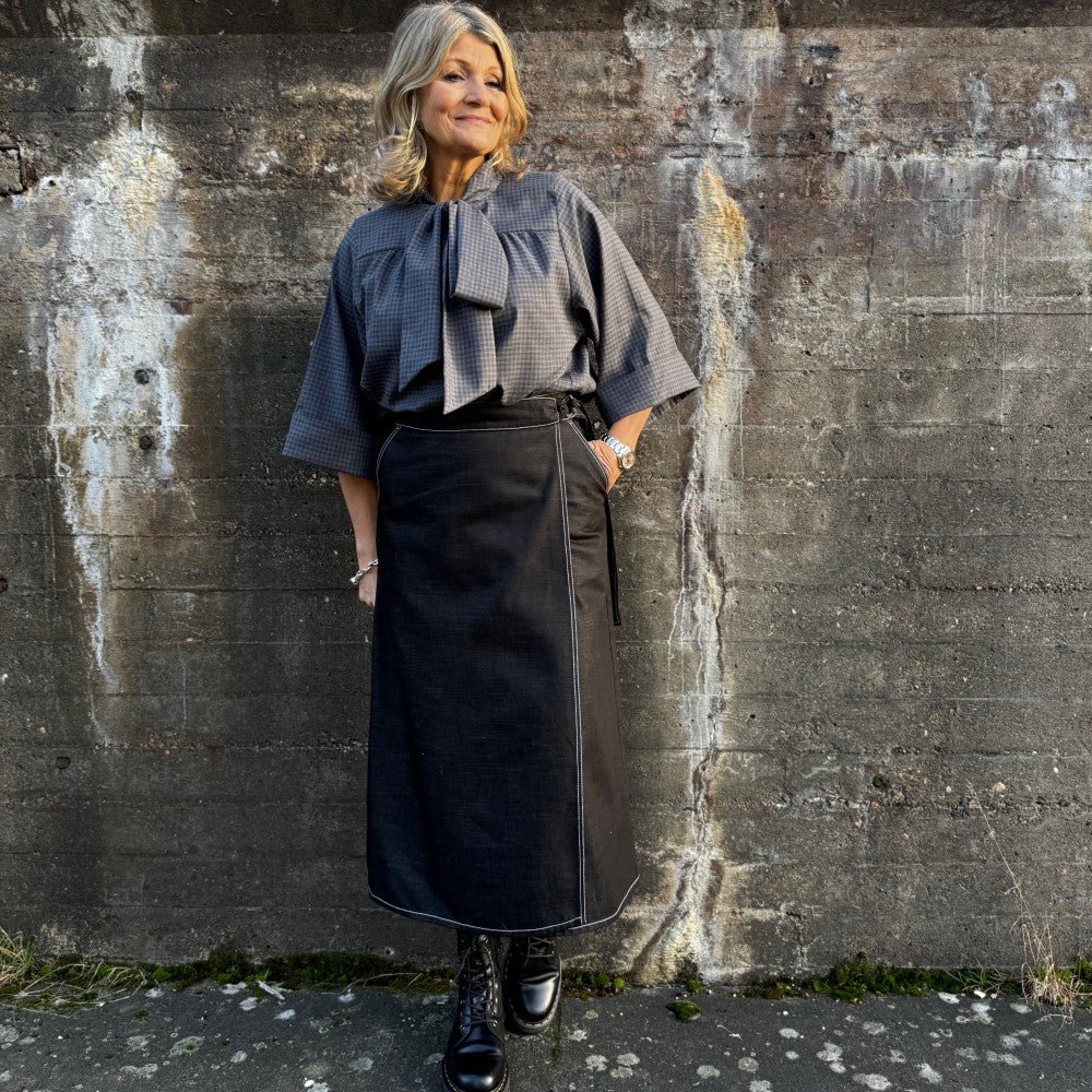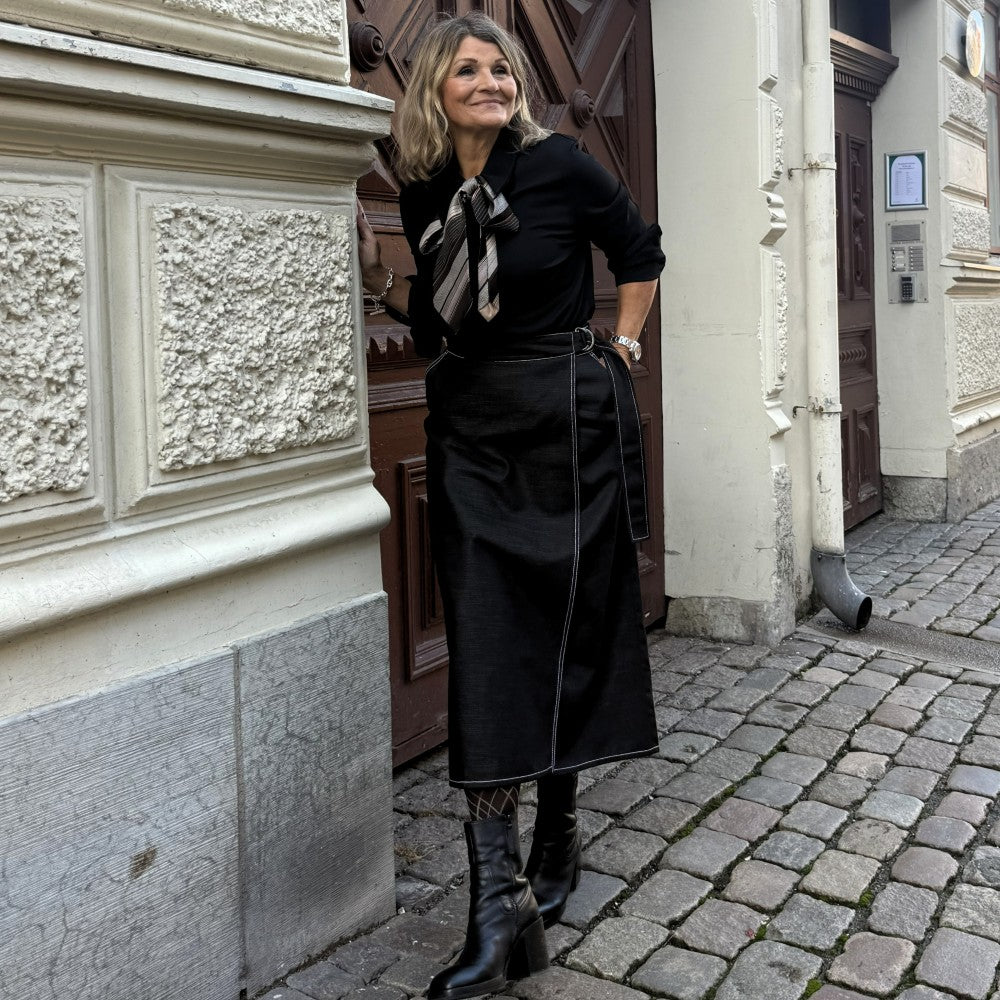 Olivia omlottkjol i storlekarna s, m och l är verkligen en riktigt snygg och klädsam modell i svart-grå denim. Den är välarbetad med vita stickningar, fickor och en skärning som öppnar sig på ett snyggt sätt och stängs med ett skärp som man drar åt.