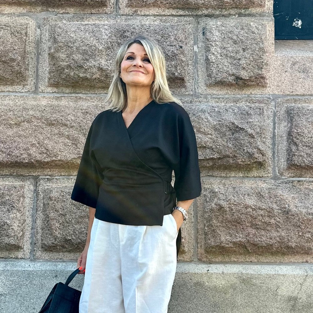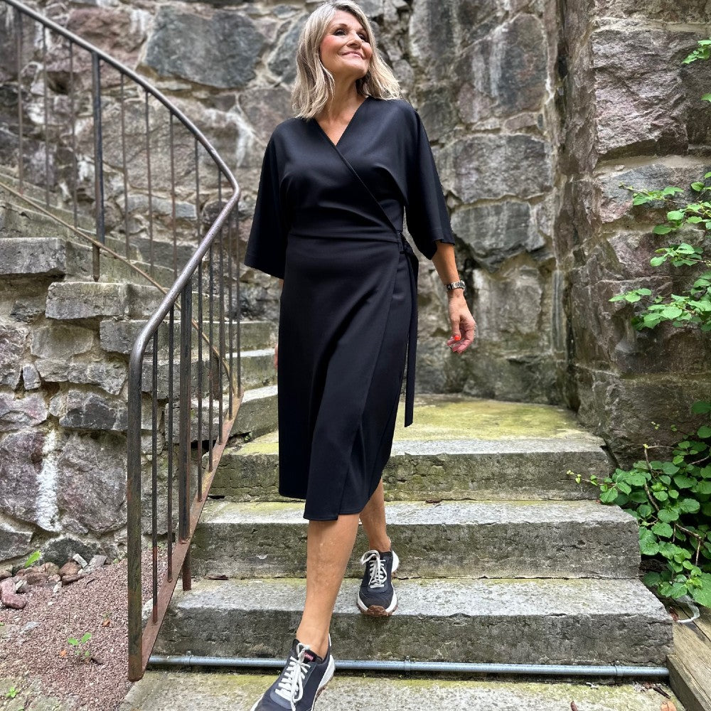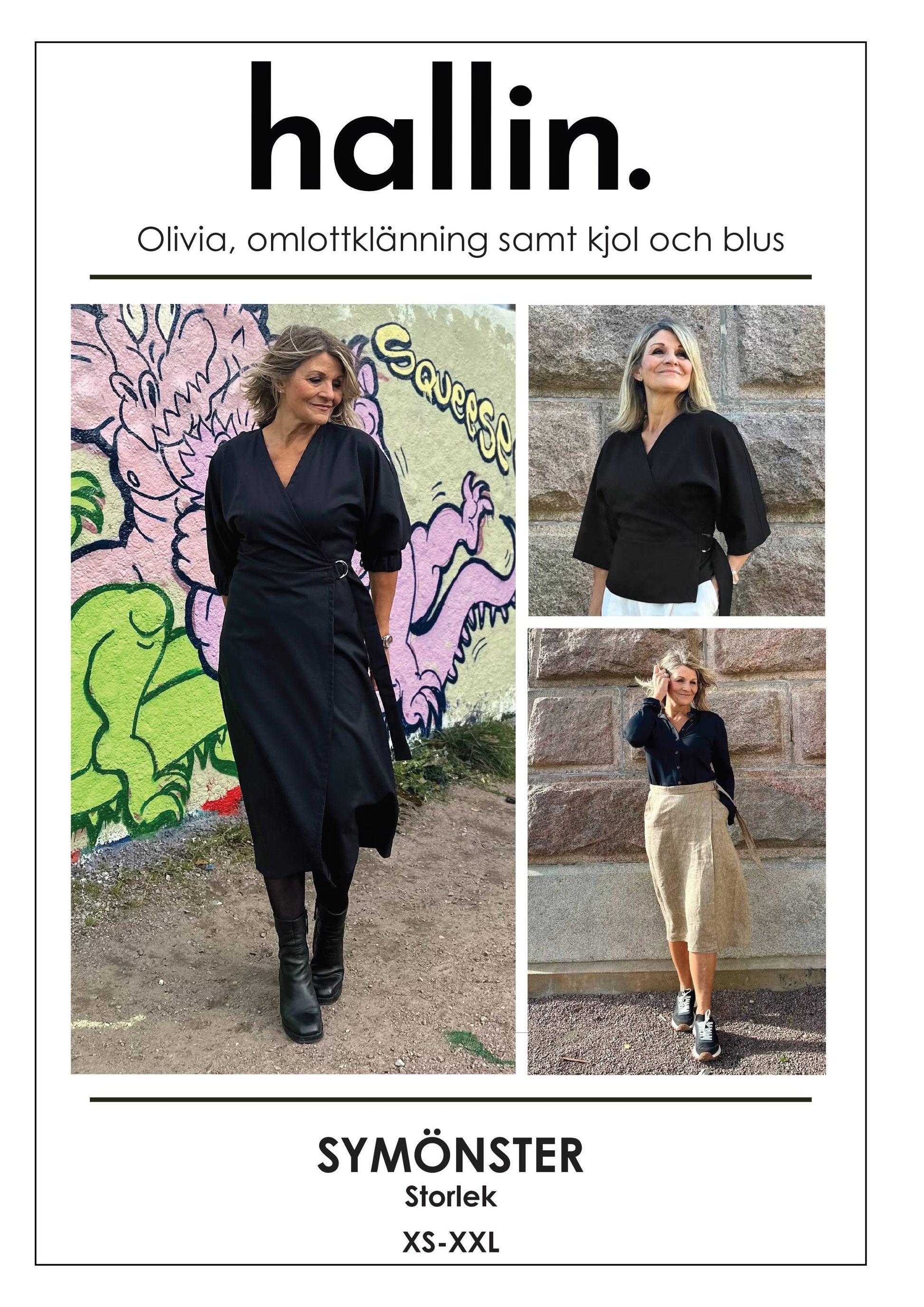 Olivia är en snäv omlottklänning med kimono-ärm. Av mönstret kan du sy både klänning, kjol och blus. Dessutom är mönstret uppdaterat med en lite smalare ärm utan rynk och resår.