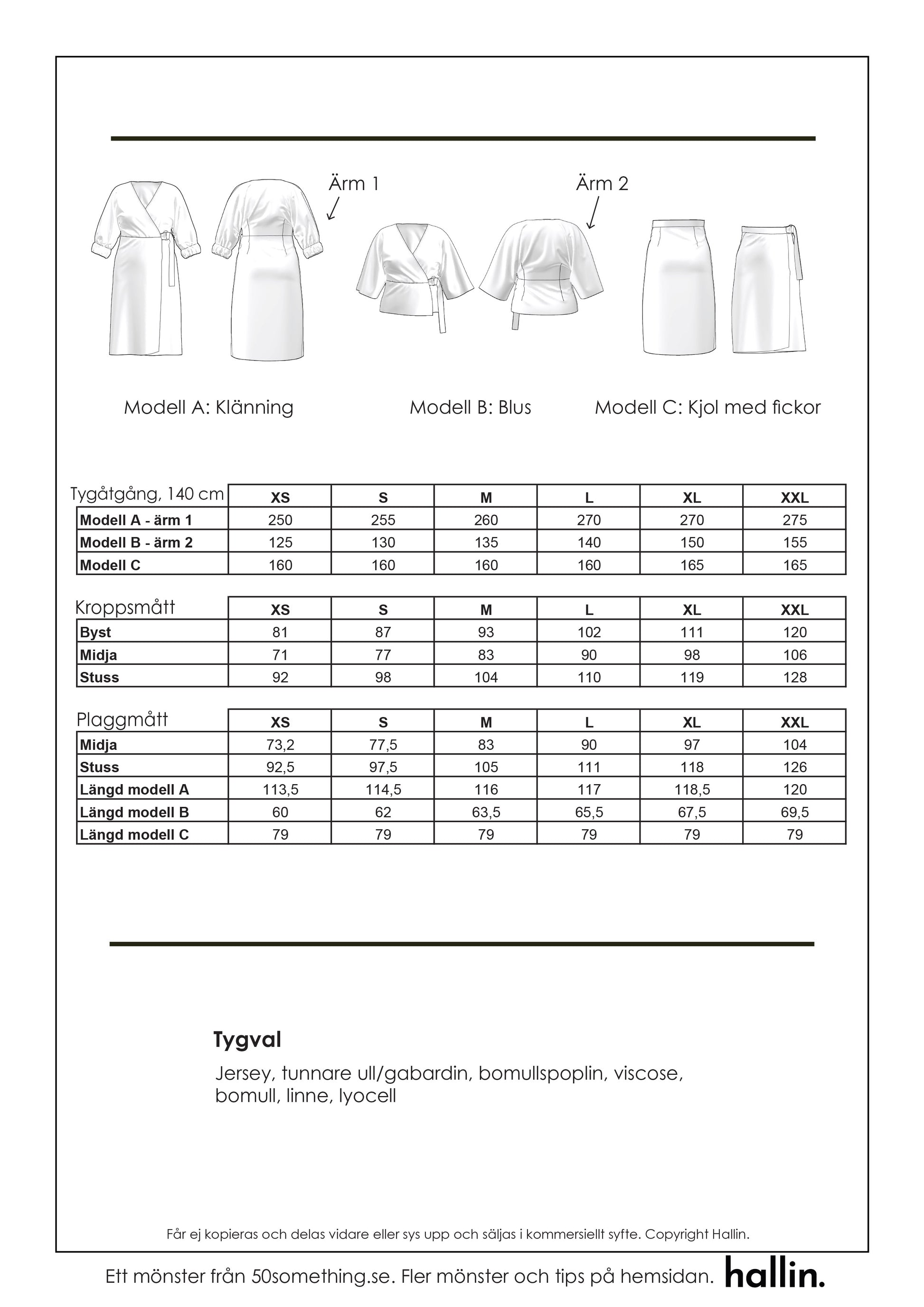 Plaggen på bilderna är alla sydda i tunnare ullblandning samt linne (kjolen). Mönstret går dock att sy i en mängd olika tyger: Ulltyger i olika tjocklekar, jersey (bomull eller viscose), bomullspoplin, viscose, lyocell mm.