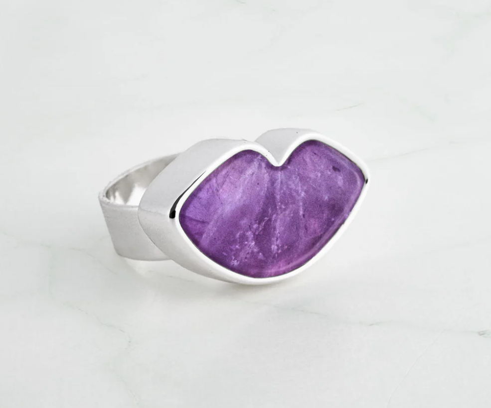 Lite Taste i silverpläterad mässing har en munformad Ametist som mäter 30 x 15mm.