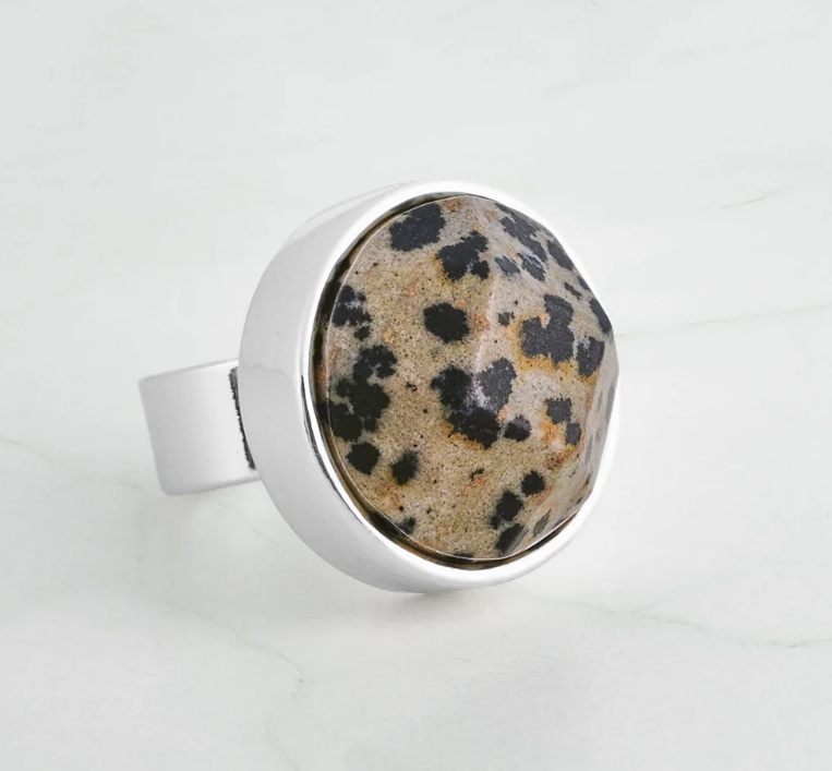 Lite Prick i silverpläterad mässing har en rund Dalmatiner Jaspissten som mäter 20 mm i diameter.
