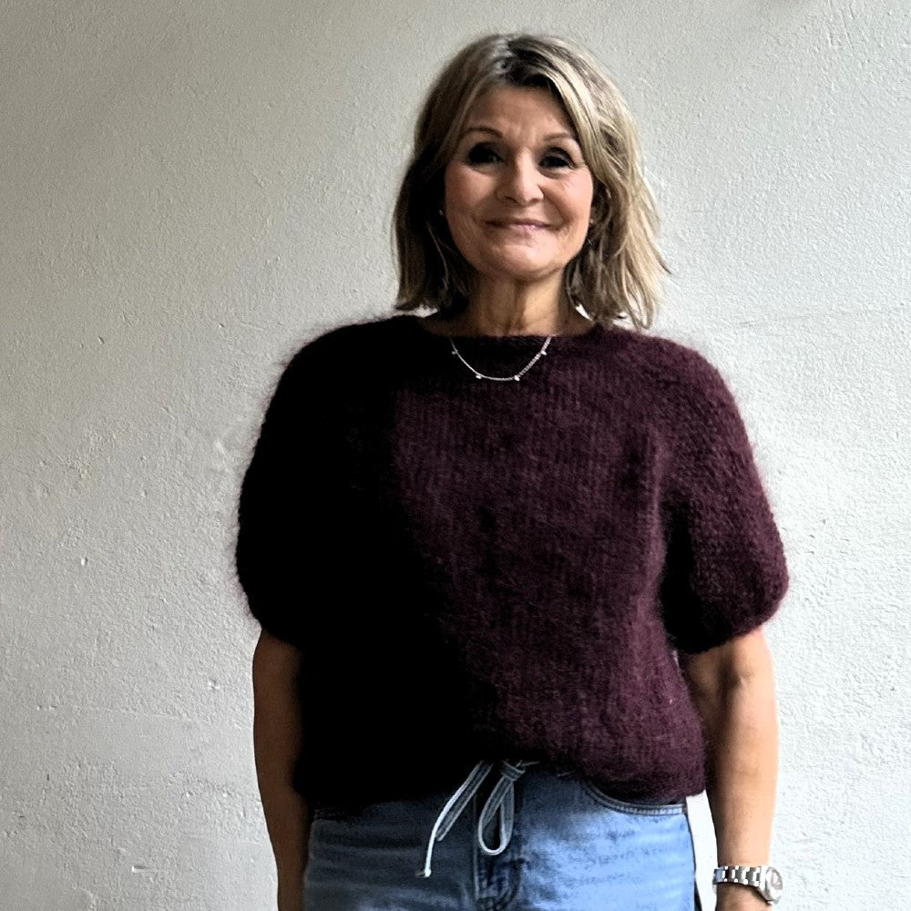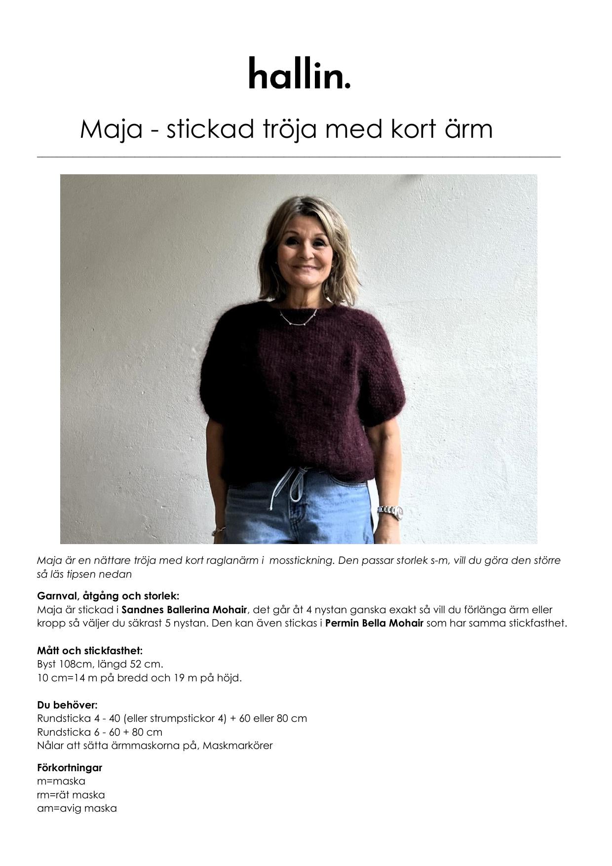 Maja är en nättare tröja med kort raglanärm i mosstickning. Den passar storlek s-m, vill du göra den större så finns det enkla tips att följa i mönstret. Jag har vanligen storlek m. Den stickas i mohairgarn med stickor 4 och 6 uppifrån och ner.