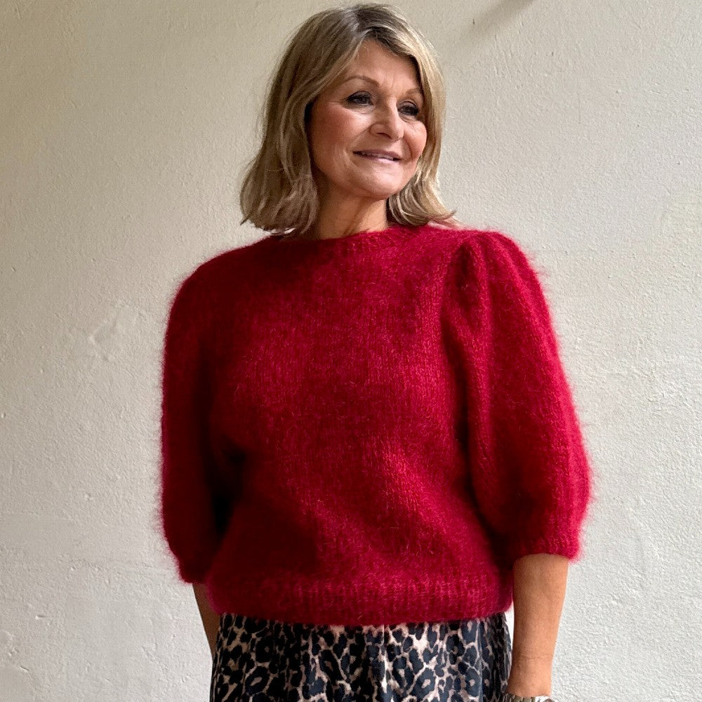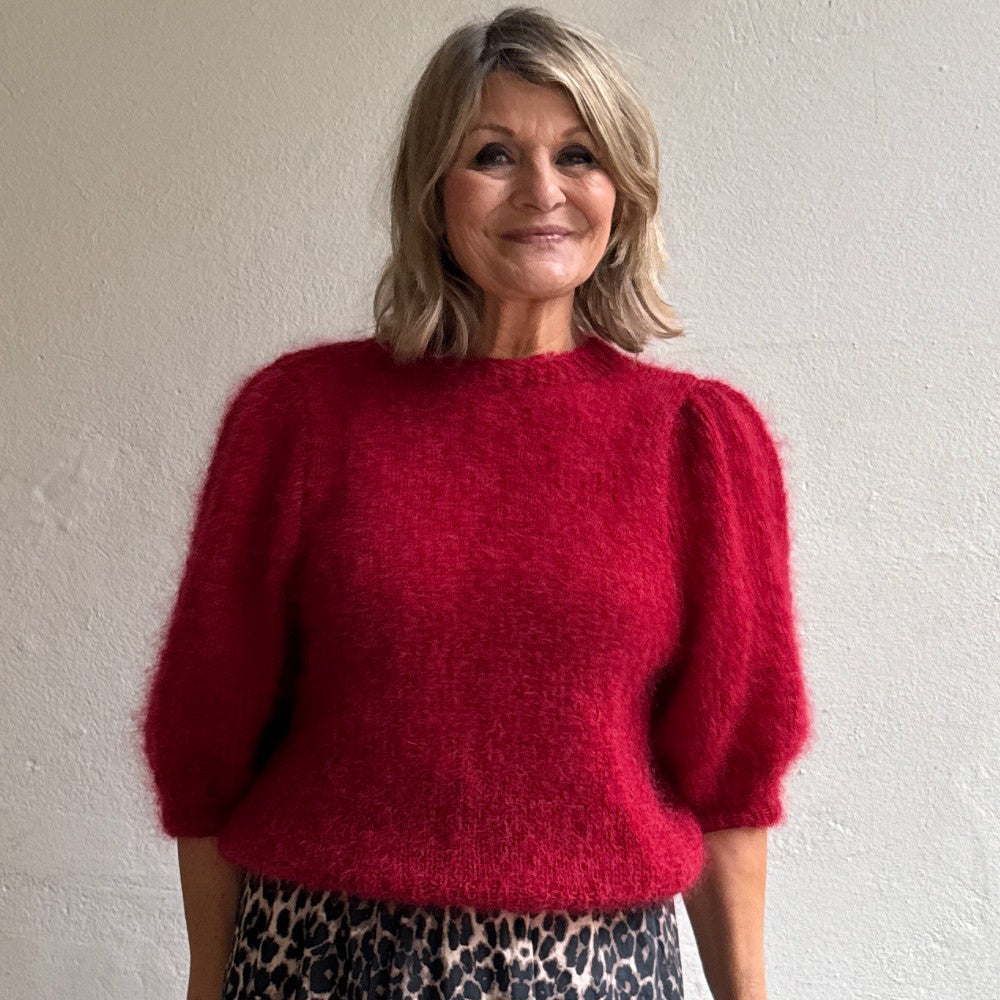 Maria är mitt första stickmönster som stickas på två stickor. Det har varit efterfrågat så jag hoppas att du tycker om modellen. Maria har en kortare puffig ärm med lite rynk och är lite kortare. Den är i en storlek som passar s-l beroende på hur du vill att den ska sitta. Längden är 55 cm och bystvidd 114 cm.