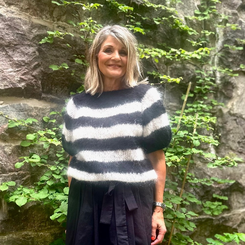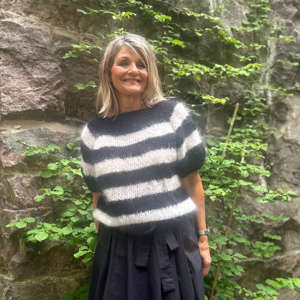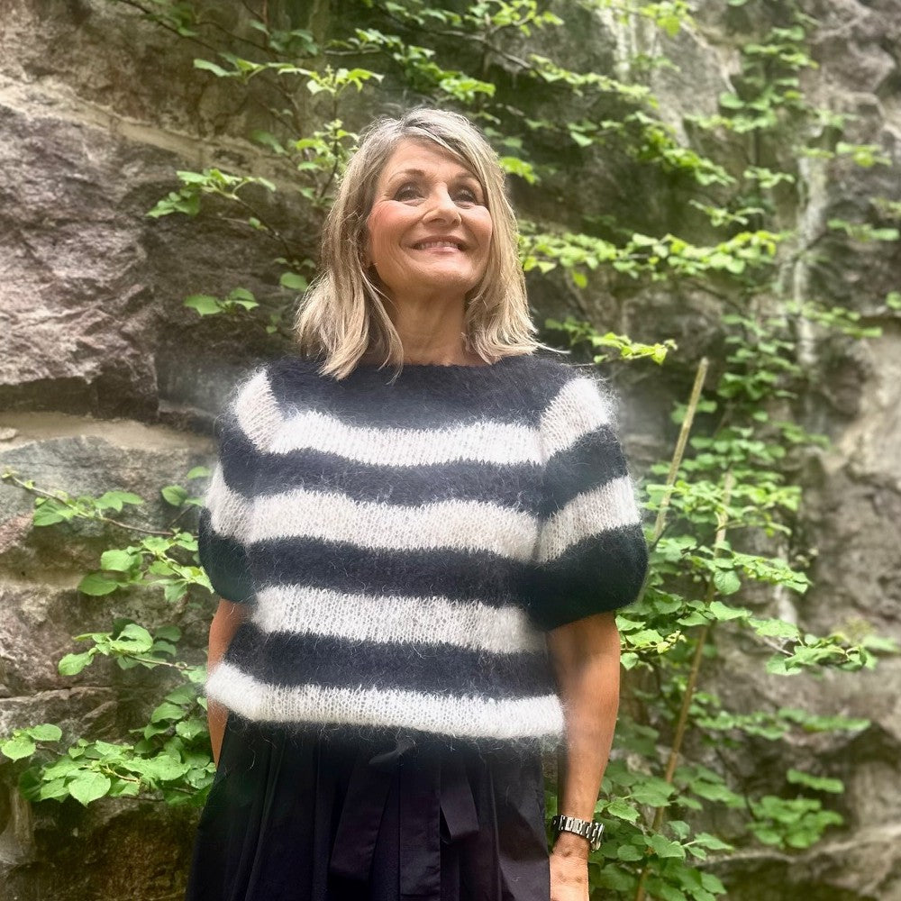 Tilda är en kortärmad stickad tröja med raglanärm som stickas med stickor 6 i mohair som finns i en storlek och passar s-l.