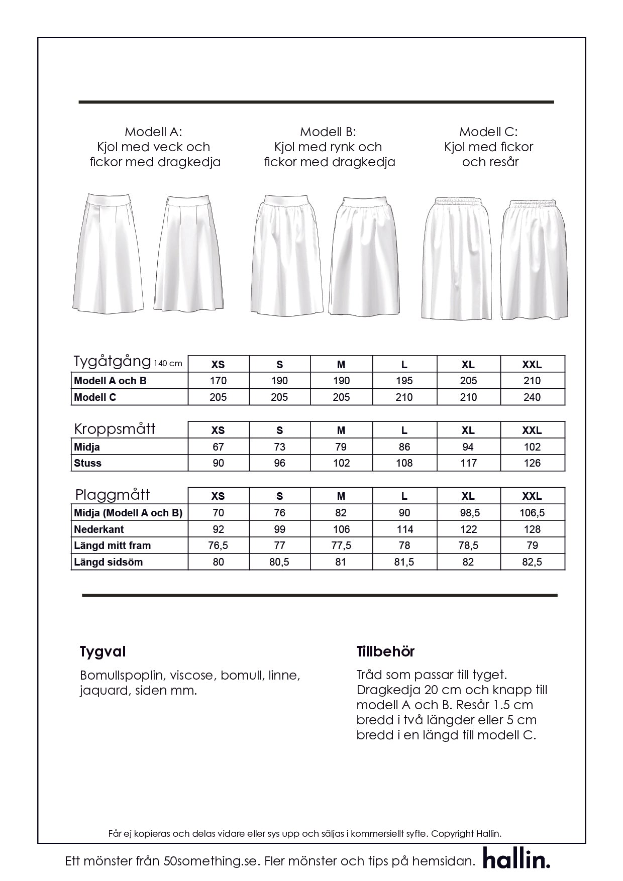 Modell A är det två lagda veck fram- och baktill, modell B har en rynkad linning och modell C är lättsydd då det är resår i midjan. Men låt dig inte avskräckas av dragkedjan, jag visar som alltid med tydliga bilder hur du ska sy, steg för steg.