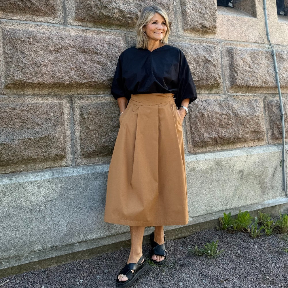 Gun kjol har snedfickor som är lite enklare att komma in i och har dragkedja i sidan i modell A vilket Tyra saknar i en liknande modell. Den är inte heller riktigt lika vid och puffig och är lite mer skuren upptill för bättre passform.