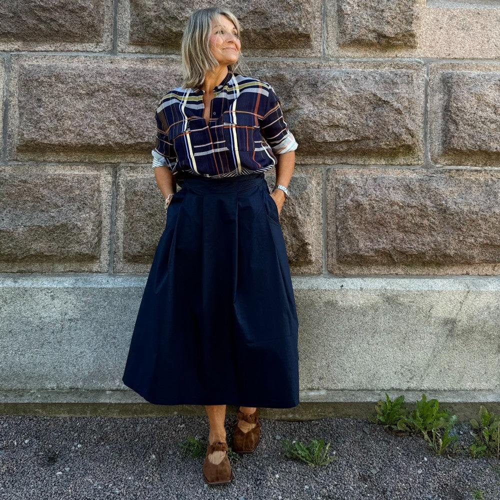 Gun passar till flera tyger. Här har jag valt bomullstyger men det går lika bra med linne, viscose (som får ett lite "plattare" fall) eller varför inte sy en festlig kjol i jaquard.